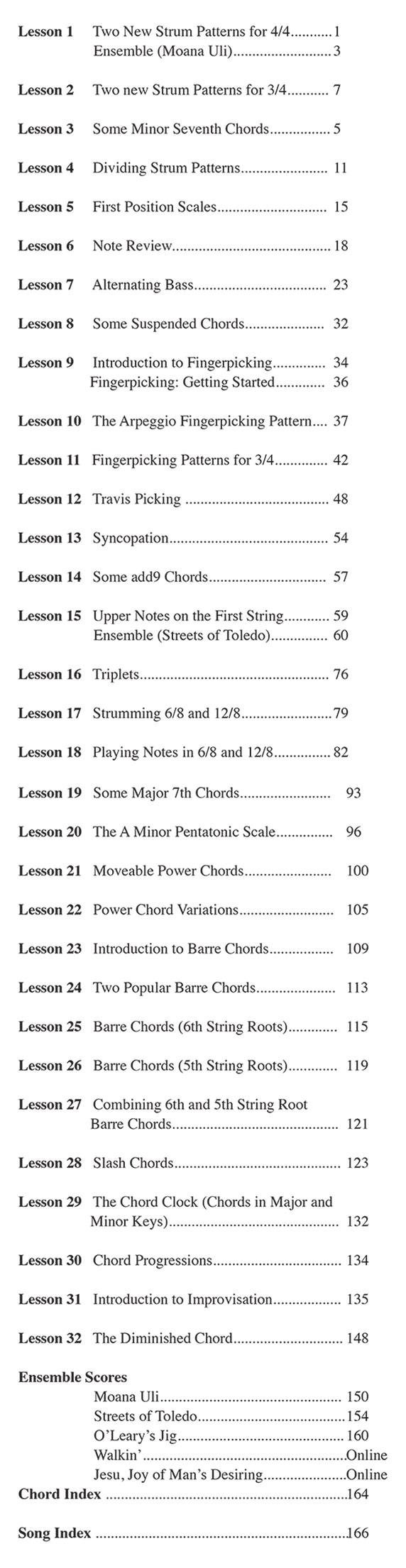 The curriculum moves forward with the addition of new chord vocabulary in the open position, as well as movable power chords and barre chords. More complex strum patterns syncopated rhythms. Fret board knowledge expands to include upper position reading on treble strings.